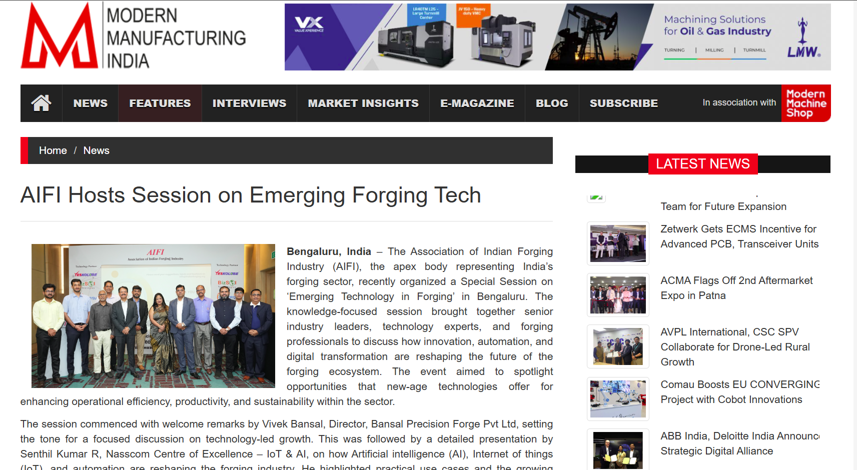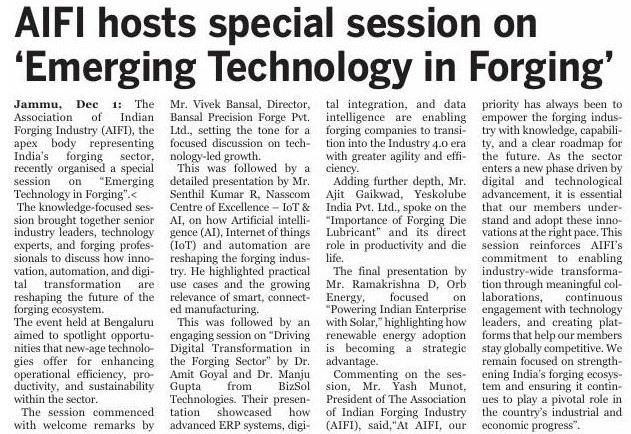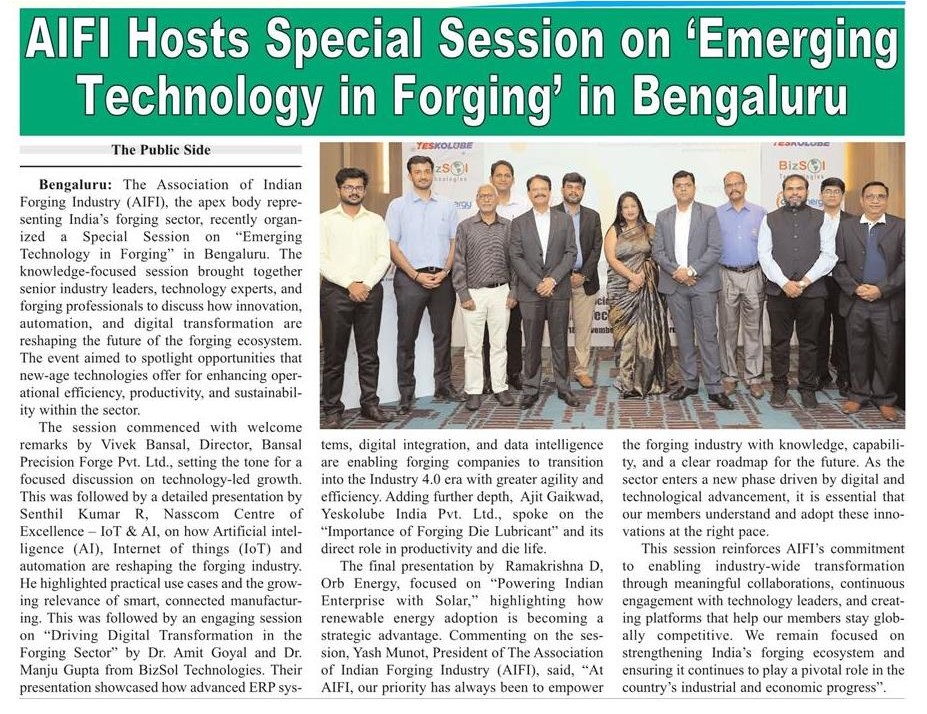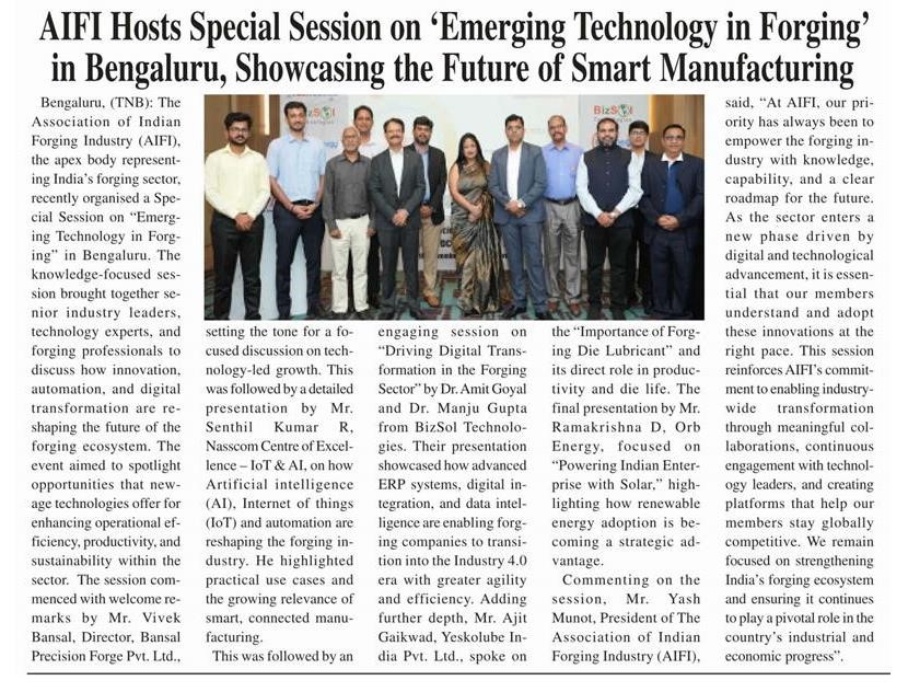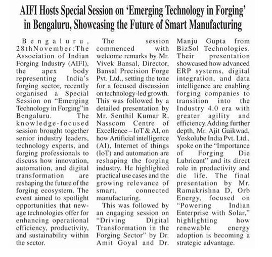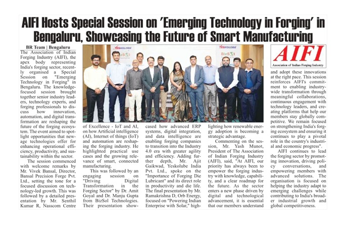 AIFI Hosts Special Session on ‘Emerging Technology in Forging’ in Bengaluru, Showcasing the Future of Smart Manufacturing